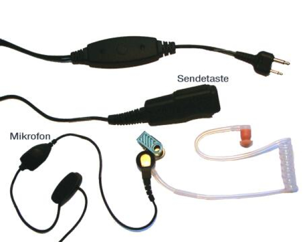 AE 31 Ohrhörer-Mikrofonset zum unauffälligen Tragen, speziell für Sicherheitsdienste. Der Ohrstöpsel ist über einen unauffälligen Schallschlauch mit dem Transducer verbunden, Mikrofon und getrennte Sprechtaste werden unauffällig an der Kleidung befestigt.